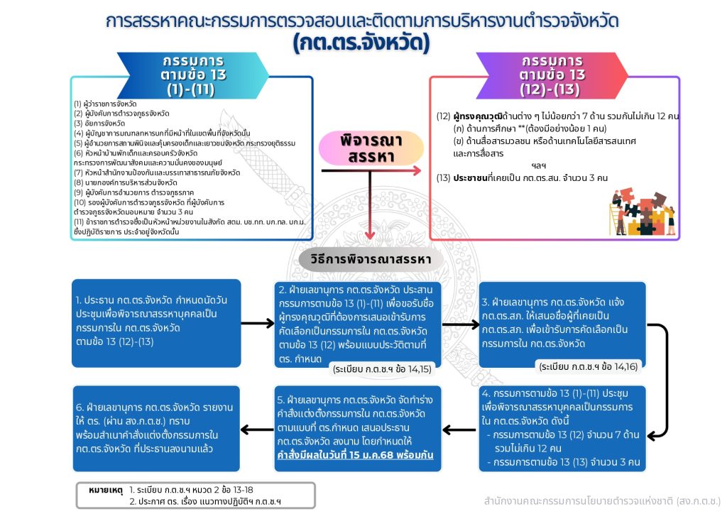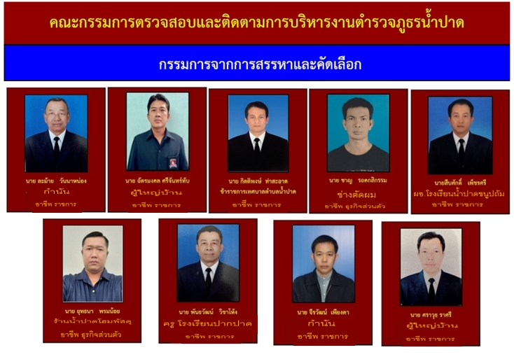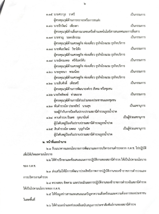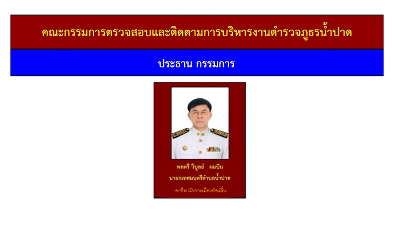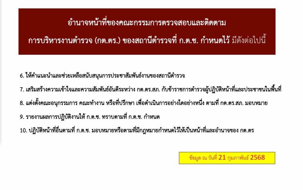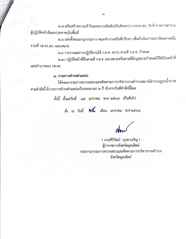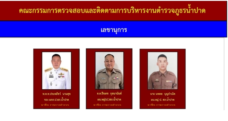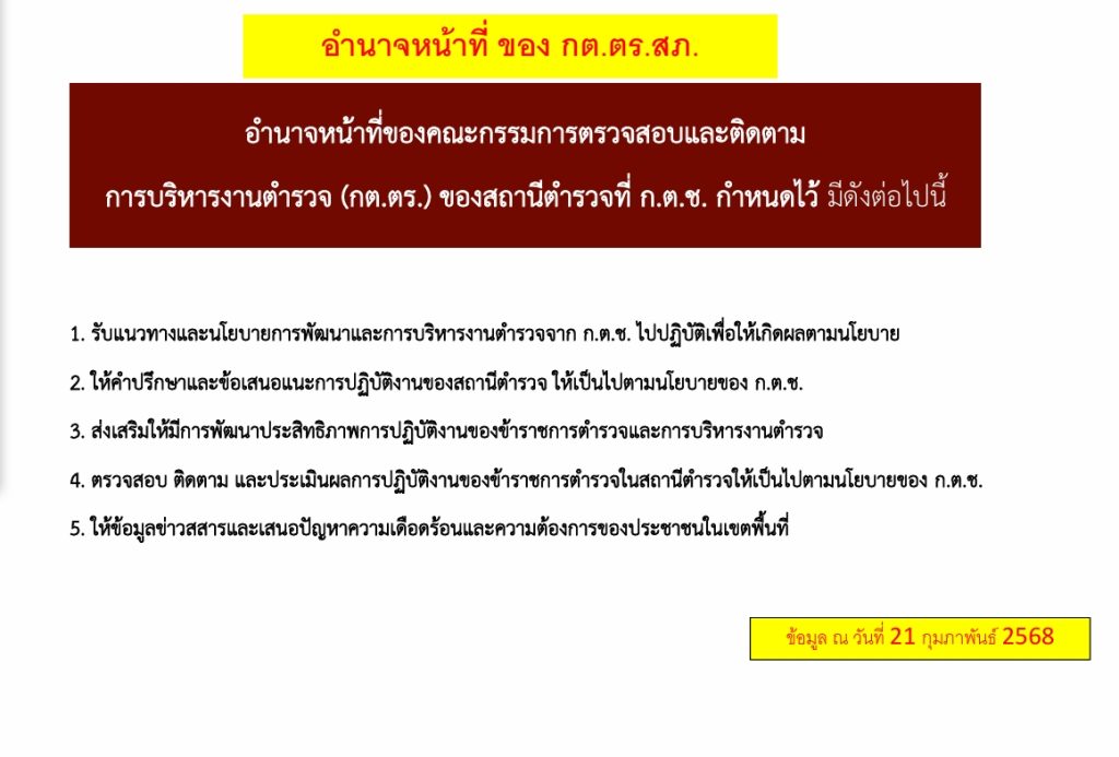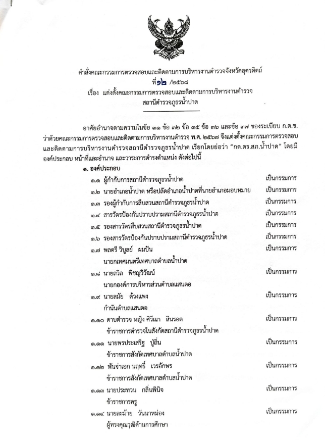 ข้อมูลคณะกรรมการตรวจสอบและติดตามการบริหารงานตำรวจ (กต.ตร.) ของสถานีตำรวจ 12 มกราคม 2567 โดย admin / ไม่มีหมวดหมู่ บทบาทและอำนาจหน้าที่ ของ กต.ตร. ผังรายชื่อคณะกรรมการ กต.ตร.สถานีตำรวจ ข้อมูล ณ 30 ม.ค. 2568 คำสั่งแต่งตั้ง กต.ตร. ข้อมูล ณ 21 ก.พ. 2568 เอกสารแนวทางการแต่งตั้ง กต.ตร. ตามระเบียบ ก.ต.ช.2567 1. ระเบียบ ก.ต.ช.ว่าด้วย กต.ตร. 2567 2.แนวทางสรรหาและแต่งตั้ง กต.ตร 3.ผังโครงสร้างและอำนาจหน้าที่ ผลการดำเนินงานของ กต.ตร.สภ.น้ำปาด ปีงบประมาณ 2568 เดือน ตุลาคม 2567 วันที่ 18 ตุลาคม 2567 เวลา 12:00 น. พ.ต.อ.อัครเดชนินธร ทวีสินวัฒนเดชา ผกก.สภ.น้ำปาด พร้อมชุดจิตอาสา กต.ตร.สภ.น้ำปาด ออกตรวจเยี่ยมให้กำลังใจ พร้อมมอบสิ่งของอุปโภคบริโภคแก่ผู้ป่วยติดเตียง เดือน พฤษจิกายน 2567 วันที่(28 พ.ย.2567) เวลา 15:00 น.พ.ต.อ.อัครเดชนินธร ทวีสินวัฒนเดชา ผกก.สภ.น้ำปาด พร้อม ข้าราชการตร. สภ.น้ำปาด กต.ตร.สภ.น้ำปาด ร่วมพิธีเจริญพุทธมนต์เฉลิมพระเกียรติถวายชัยมงคลแด่ พระบาทสมเด็จพระเจ้าอยู่หัว เนื่องในโอกาสวันเฉลิมพระชนมพรรษา 6 รอบ ในวันพฤหัสบดีที่ 28 พ.ย.2567 เวลา 15.00 น. ณ วัดศรีสว่างทรายขาว ม.5 ต.บ้านฝาย อ.น้ำปาด จว.อต. เดือน ธันวาคม 2567 วันที่(27 ธ.ค.2567) เวลา 08:00 น.พ.ต.อ.อัครเดชนินธร ทวีสินวัฒนเดชา ผกก.สภ.น้ำปาด พร้อม กต.ตร.สภ.น้ำปาด ได้ร่วมพิธีเปิดศูนย์รณรงค์ป้องกันและลดอุบัติเหตุทางถนนช่วงเทศกาลปีใหม่ 2568 ณ แยกโรงพยาบาลน้ำปาด เดือน มกราคม 2568 วันที่(30 ม.ค.2568) เวลา 10:00 น.พ.ต.อ.อัครเดชนินธร ทวีสินวัฒนเดชา ผกก.สภ.น้ำปาด กต.ตร.สภ.น้ำปาด ได้ประชุม กต.ตร.สภ.น้ำปาด ครั้งที่ 1/68 ณ ห้องประชุม สภ.น้ำปาด โดยที่ประชุมมีมติเลือก พล.ต.วิบูลย์ ผมปัน เป็นประธาน กต.ตร.สภ.น้ำปาด เดือน กุมภาพันธ์ 2568 วันที่ ( 21 ก.พ. 68) เวลา 09.30 น.พ.ต.อ.อัครเดชนินธร ทวีสินวัฒนเดชา ผกก.สภ.น้ำปาด พร้อมข้าราชการตำรวจสภ.น้ำปาด และ ชุดจิตอาสา กต.ตร.สภ.น้ำปาด ร่วมกิจกรรมจิตอาสาพัฒนา แหล่งศิลปวัฒนธรรมท้องถิ่น/สถานที่ท้องเที่ยววิถีชุมชน เพื่อยถวายเป็นพระราชกุศลน้อมรำลึกเนื่องในวันที่ระลึก พระบาทพระพุทธเลิศหล้านภาลัย ณ บริเวณพิพิธภัณฑ์พญาปาด หมู่ 1 ต.บ้านฝาย อ.น้ำปาด จ.อุตรดิตถ์ เดือน มีนาคม 2568 วันที่ 6 มีนาคม 2568 เวลา 10.00 น. พ.ต.อ.อัครเดชนินธร ทวีสินวัฒนเดชา ผกก.สภ.น้ำปาด พร้อมชุด ชมส.สภ.น้ำปาด ชุดจิตอาสา สภ.น้ำปาด ชุดจราจร กต.ตร.สภ.น้ำปาดร่วมกับ อบต.น้ำไผ่ คณะครู-นักเรียน ร.ร.บ้านห้วยเดื่อ และ ร.ร.บ้านห้วยคอม ร่วมกิจกรรมทาสีตีเส้นทางม้าลาย และบรรยายให้ความรู้เกี่ยวกับบุหรี่ไฟฟ้าและแก๊สหัวเราะให้กับ ร.ร.บ้านห้วยเดื่อ และ ร.ร.บ้านห้วยคอม อ.น้ำปาด จ.อุตรดิตถ์ FacebookFacebookXXLINELine