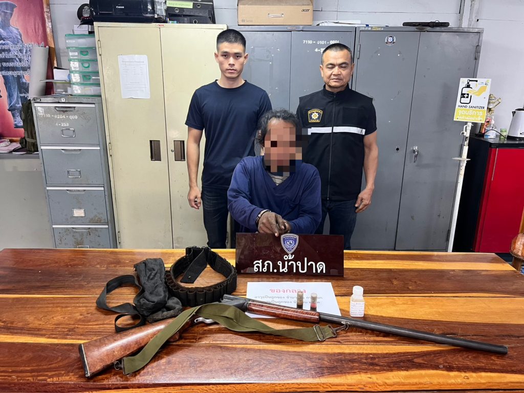 พร้อมด้วยของกลาง➡️ 1. อาวุธปืนลูกซองยาว ไม่มีเครื่องหมายทะเบียน จำนวน 1 กระบอก