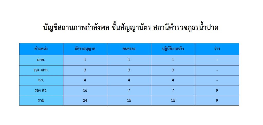 ข้อมูลผู้บริหาร อัตรากำลัง และพื้นที่รับผิดชอบ 12 มกราคม 2567 โดย admin / ข้อมูลพื้นฐาน ผู้บริหารสถานีตำรวจภูธรน้ำปาด ข้อมูล ณ วันที่ 7 มีนาคม 2568 อัตรากำลังพล (ณ วันที่ 21 เม.ย.68) พื้นที่รับผิดชอบ (ณ วันที่ 1 เม.ย.68) FacebookFacebookXXLINELine