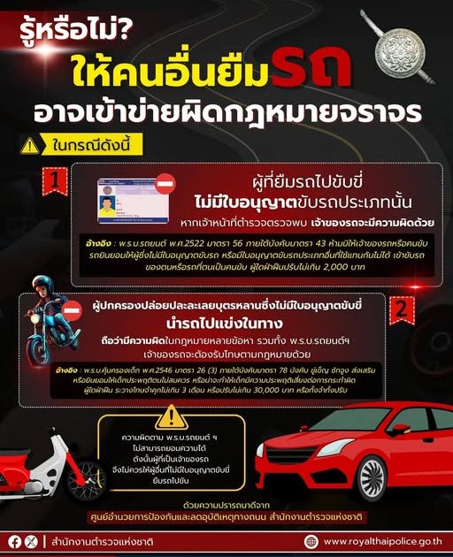 ศูนย์อำนวยการป้องกันและลดอุบัติเหตุทางถนน สำนักงานตำรวจแห่งชาติ เตือนอย่าให้ผู้อื่นยืมรถไปขับ โดยเฉพาะผู้ไม่มีใบอนุญาตขับขี่ เจ้าของรถมีความผิดตามกฎหมาย